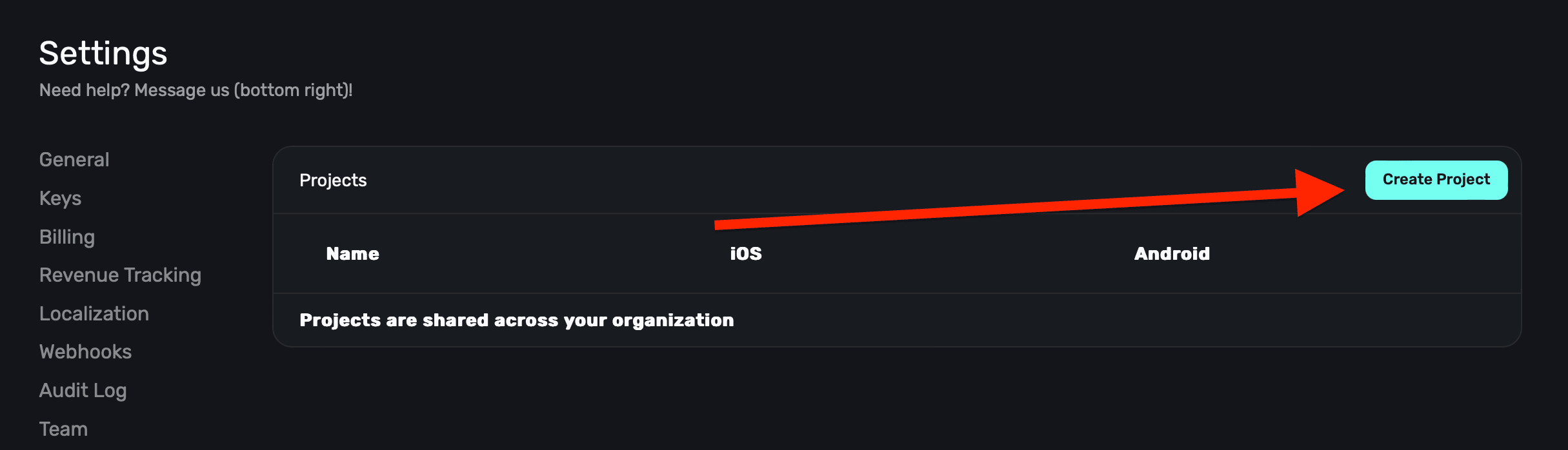 To create a new project, click the Create Project button at the top right: