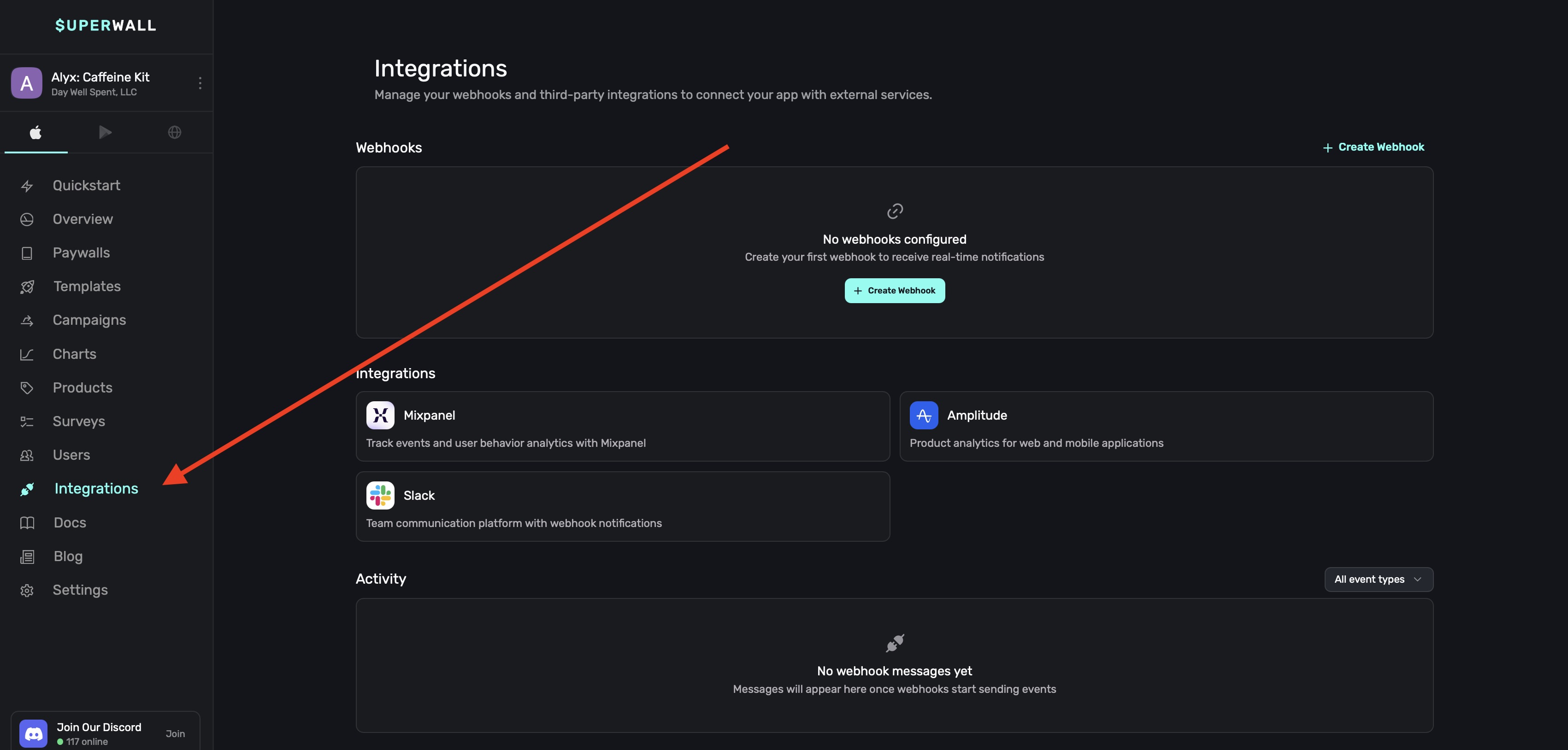 The integrations page is where you can manage your webhooks and other integrations with Superwall: