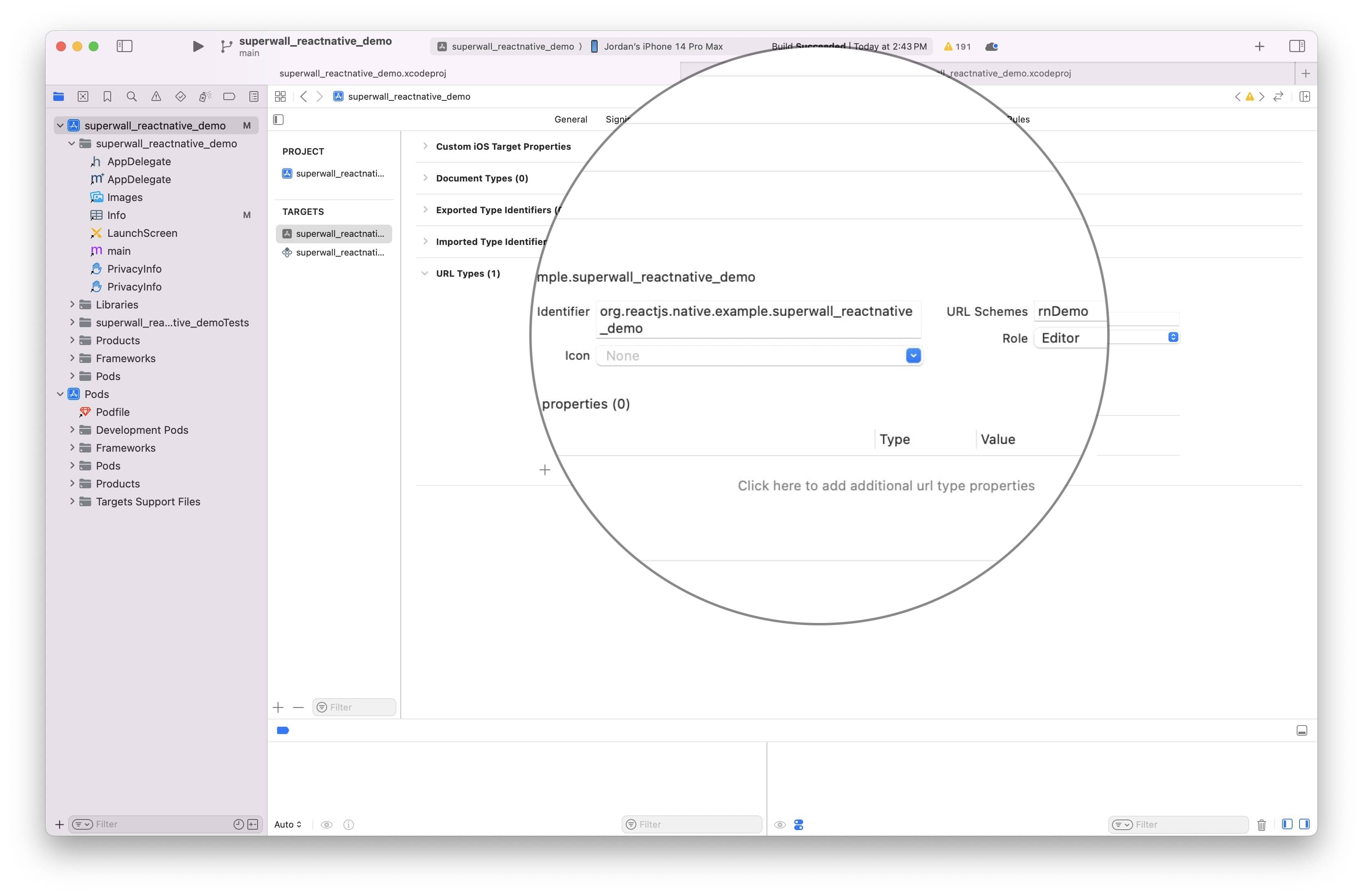 $ open ios/theProjectName.xcworkspaceOpen Xcode. In your info.plist, add a row called URL Types. Expand the automatically created Item 0, and inside the URL identifier value field, type your Bundle ID, e.g., com.superwall.Superwall-SwiftUI. Add another row to Item 0 called URL Schemes and set its Item 0 to a URL scheme you'd like to use for your app, e.g., exampleapp.